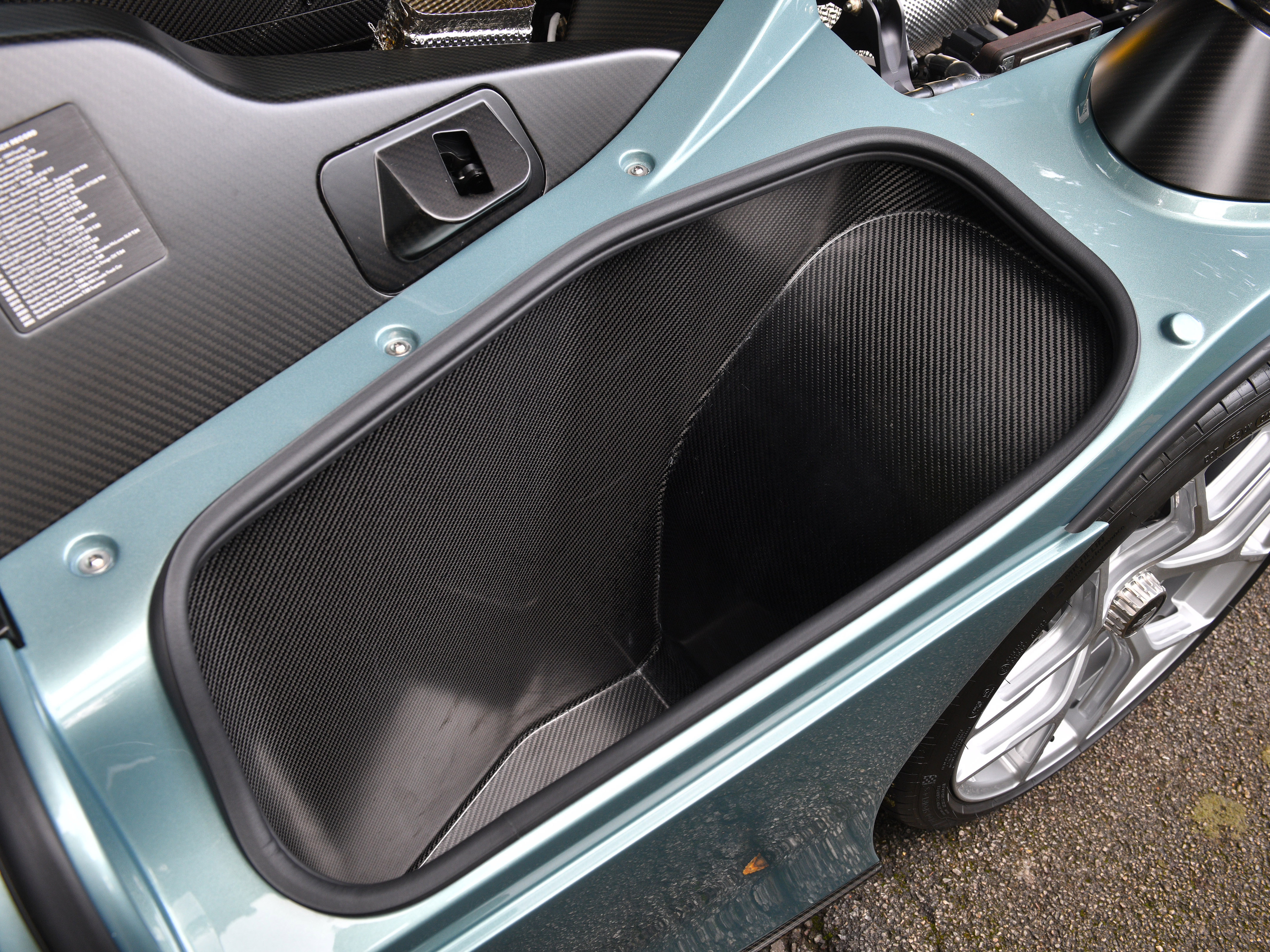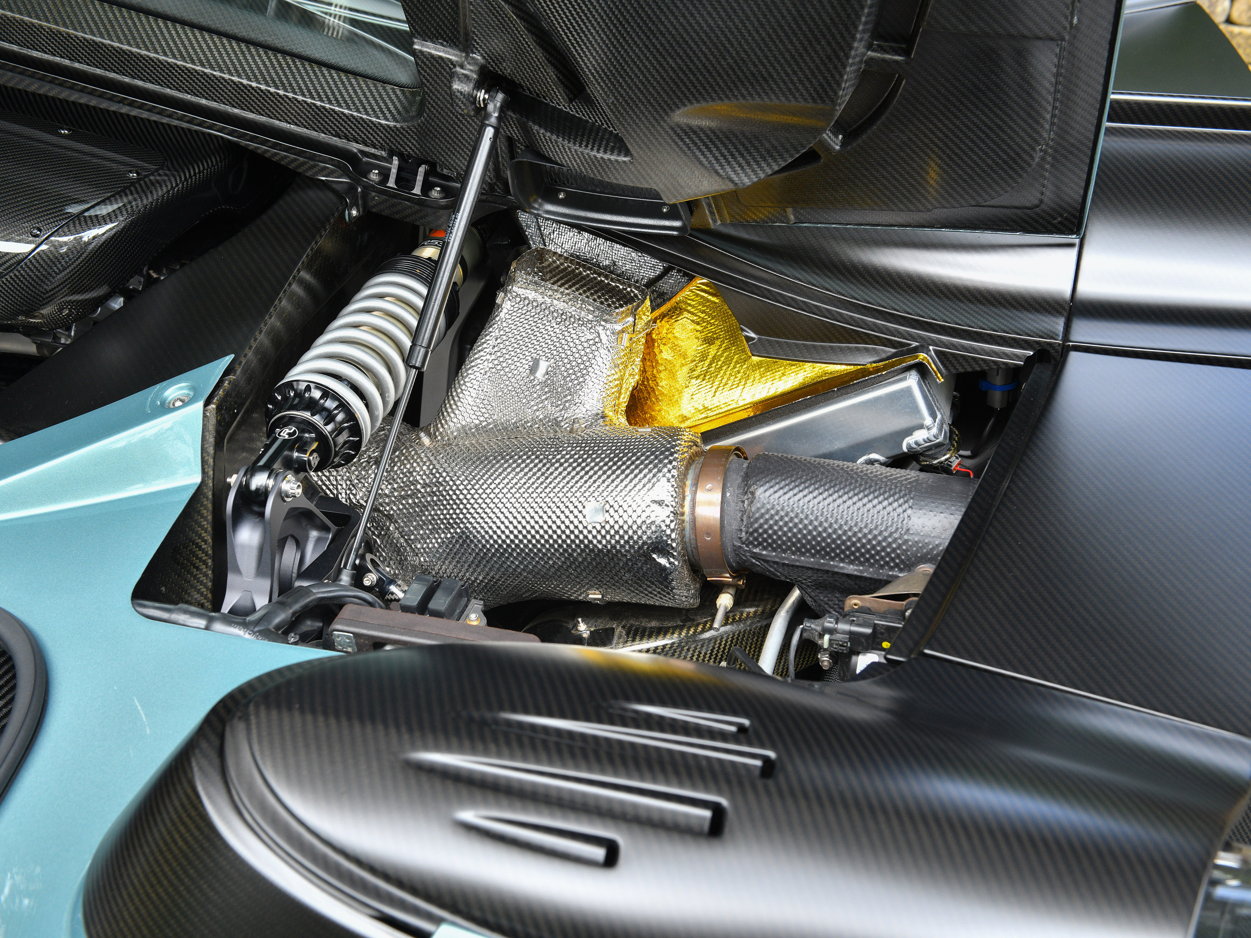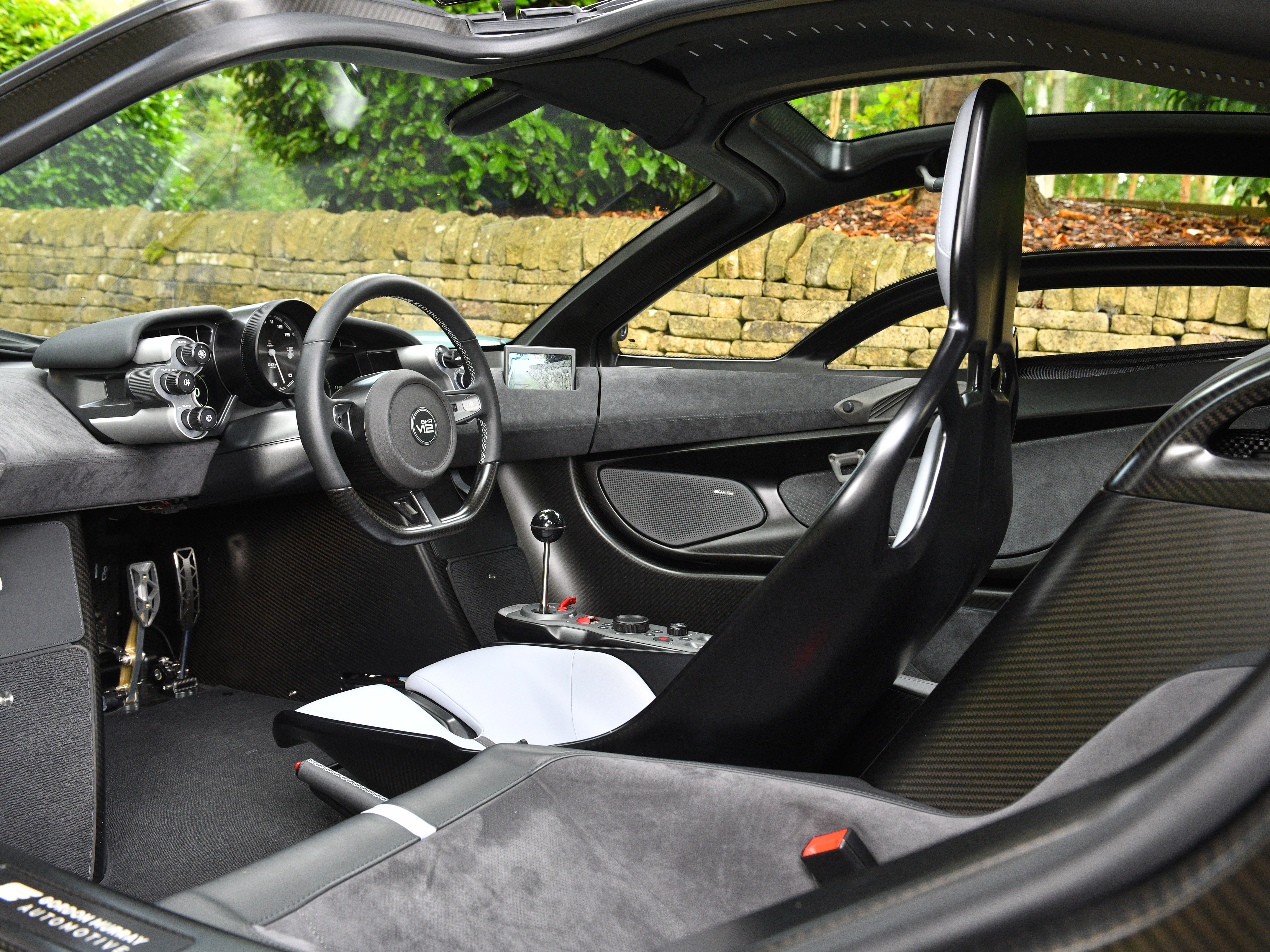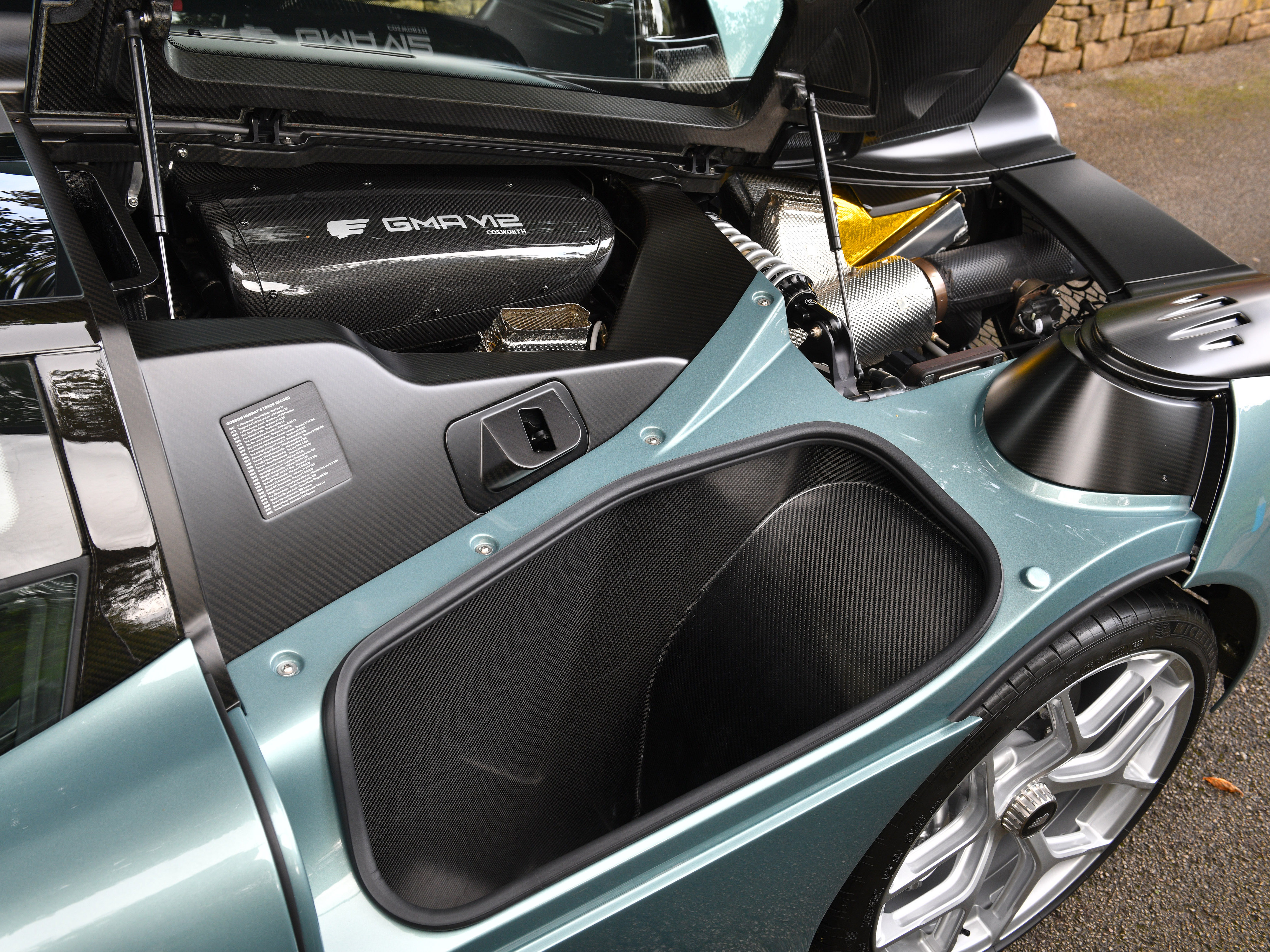 This example, chassis 063 was commissioned in the bespoke exterior colour ‘Arnage’ with bodywork panels in satin carbon fibre with a subtle tint, contrasted by a gloss carbon airbox. The exhaust and muffler were both finished in bespoke black, a non-standard factory option giving the car a purposeful edge, complemented by black cam covers, silver brake callipers and a factory glass roof.