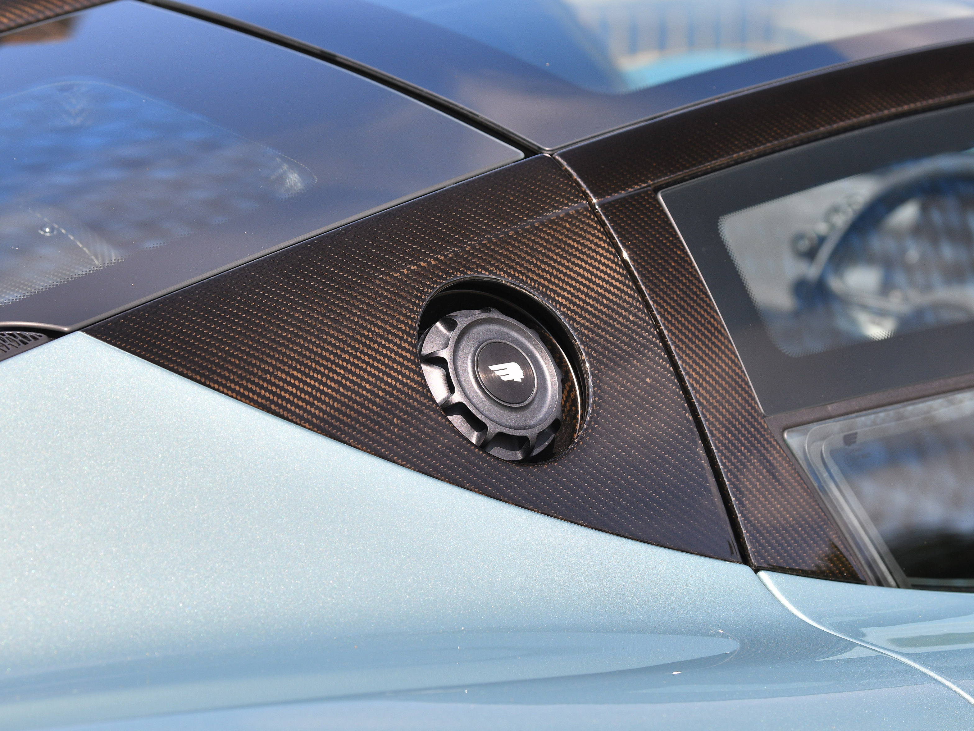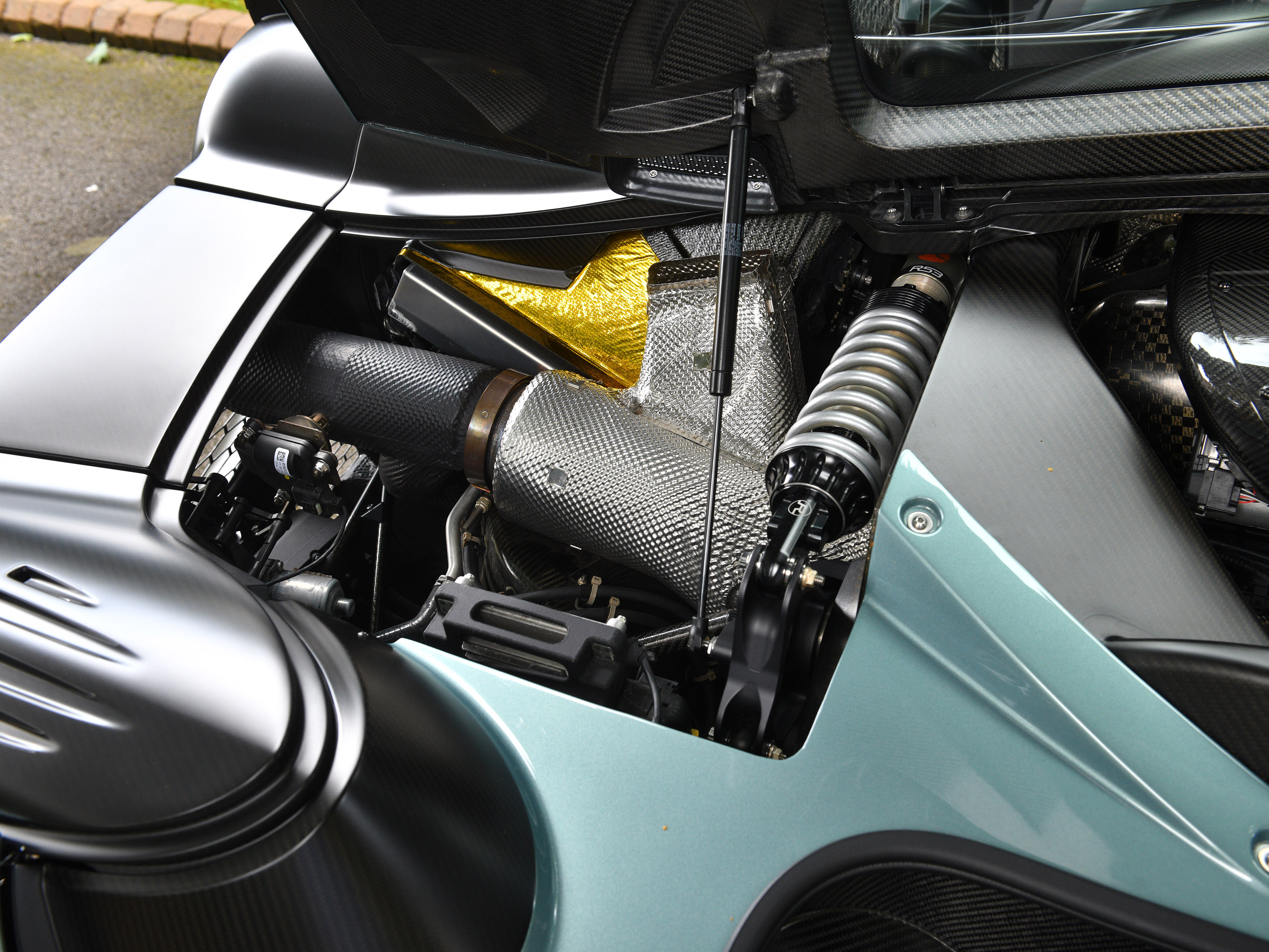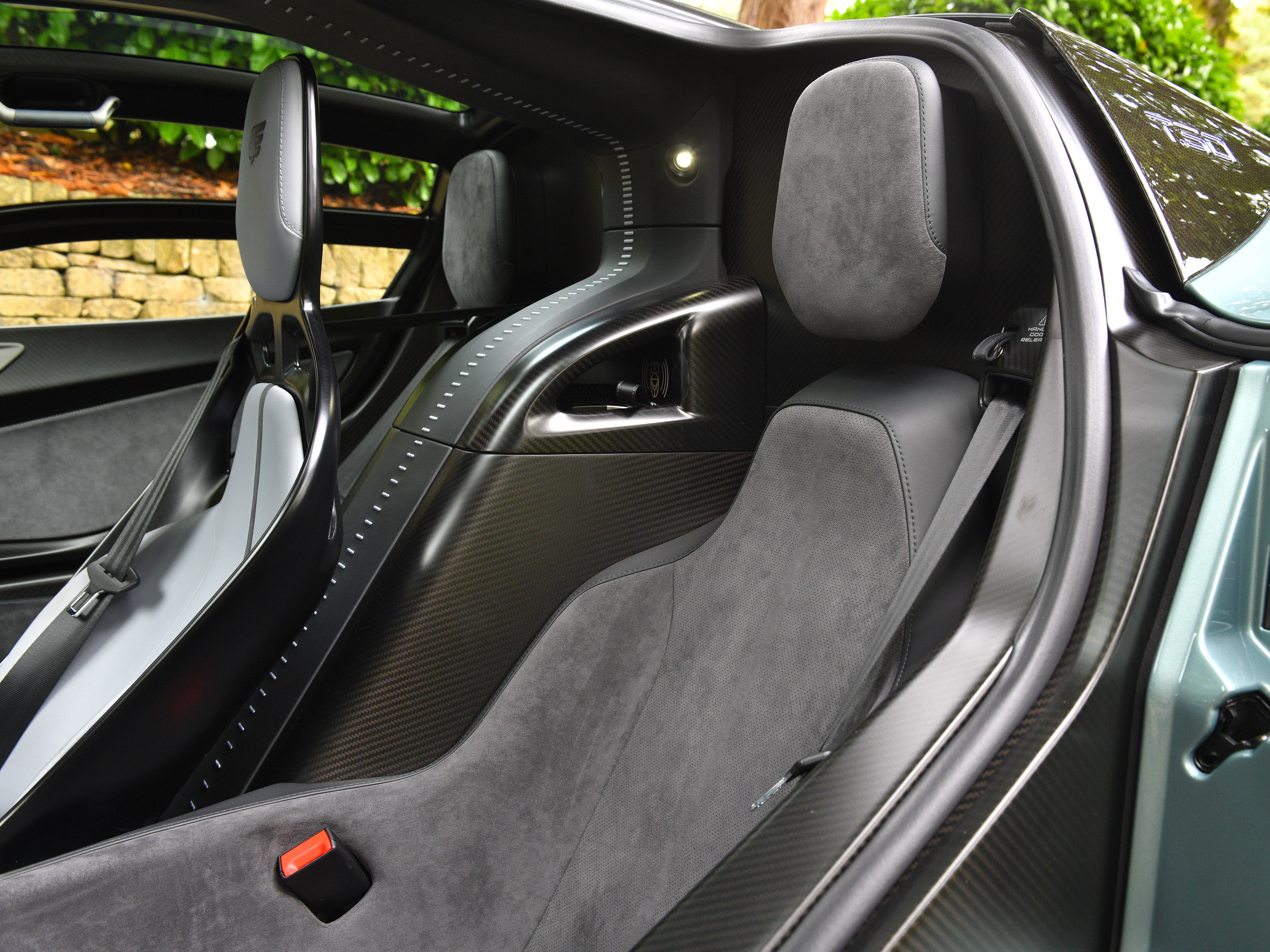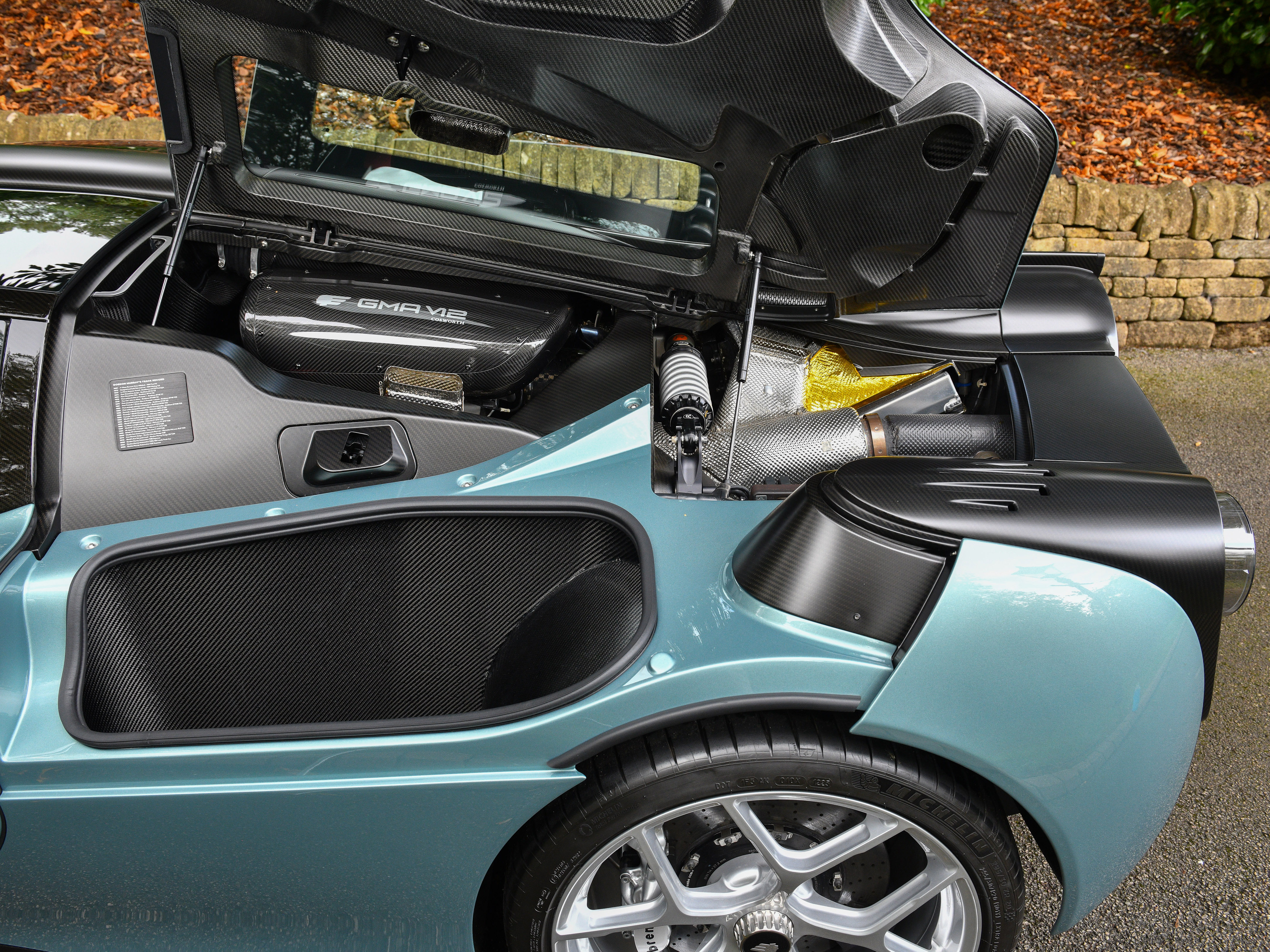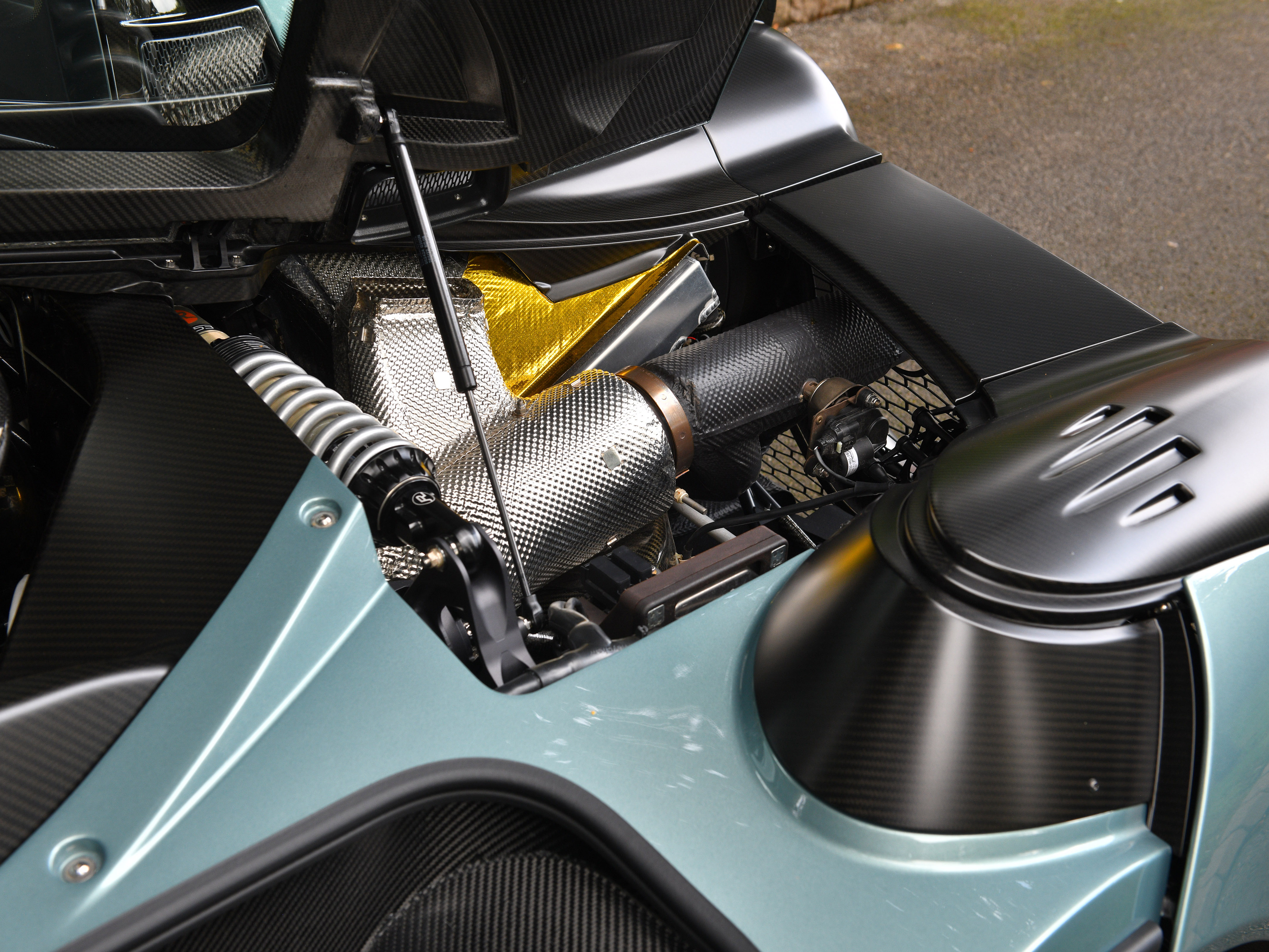 This example, chassis 063 was commissioned in the bespoke exterior colour ‘Arnage’ with bodywork panels in satin carbon fibre with a subtle tint, contrasted by a gloss carbon airbox. The exhaust and muffler were both finished in bespoke black, a non-standard factory option giving the car a purposeful edge, complemented by black cam covers, silver brake callipers and a factory glass roof.