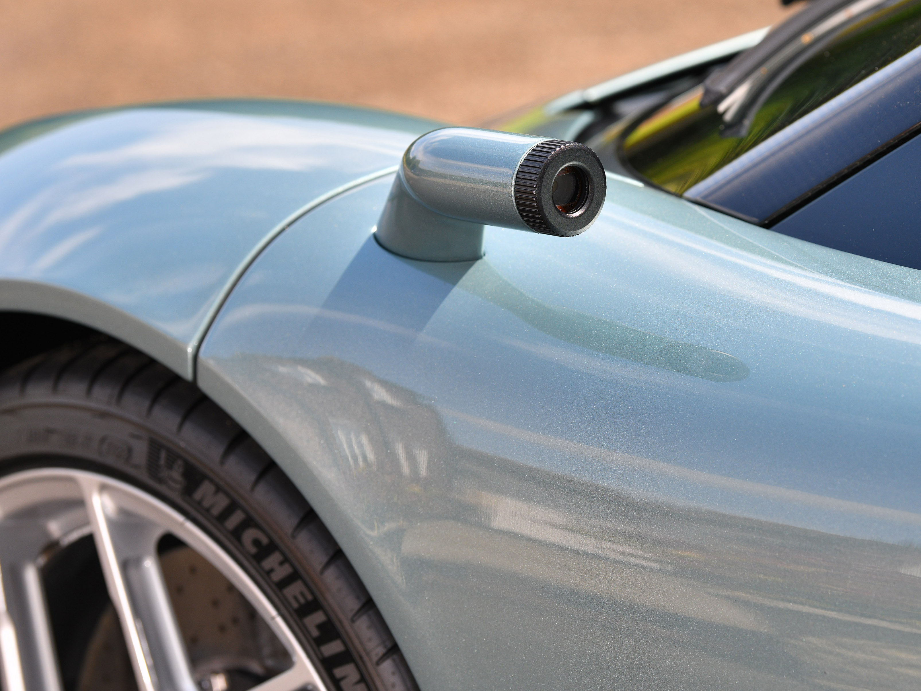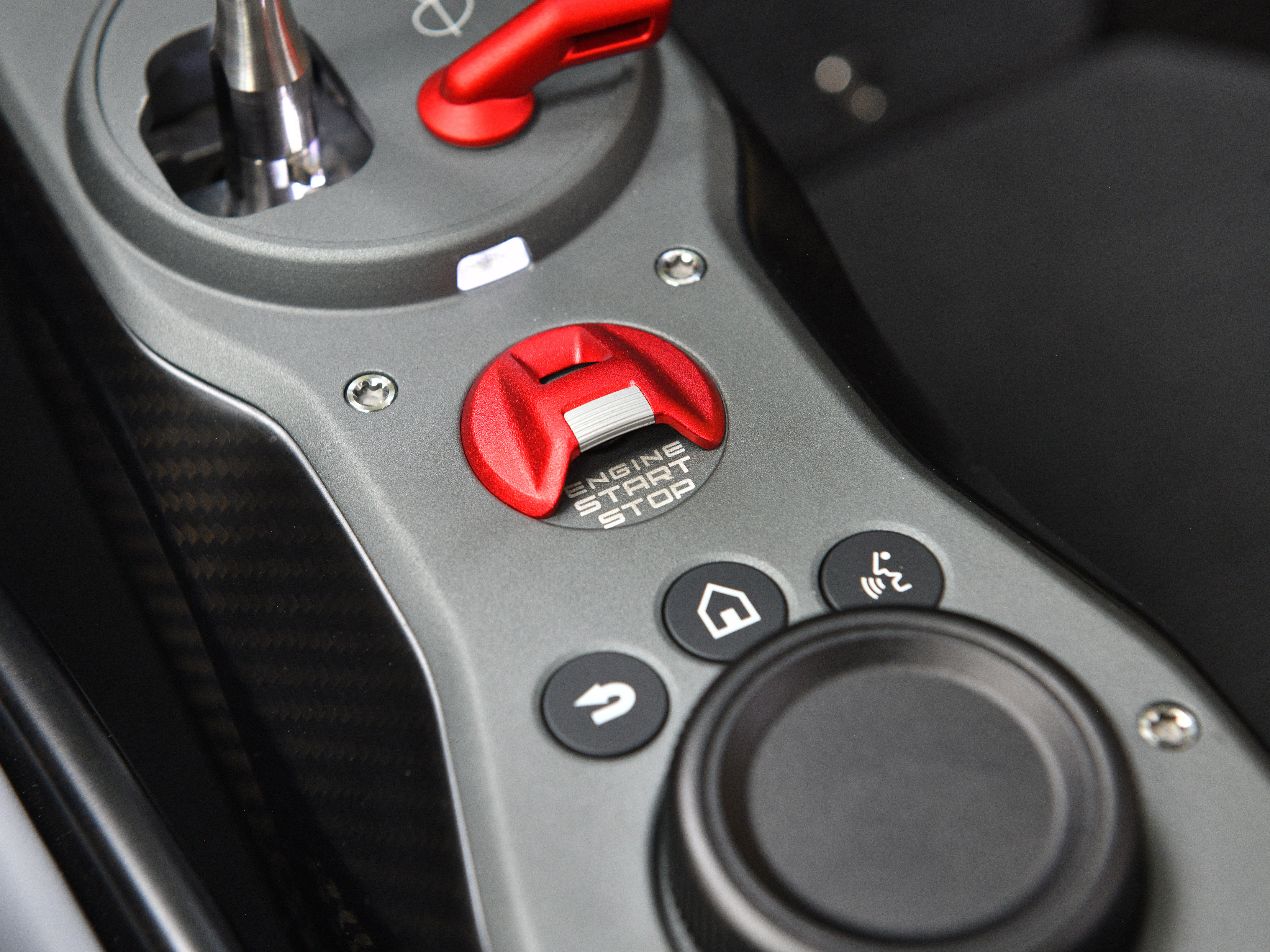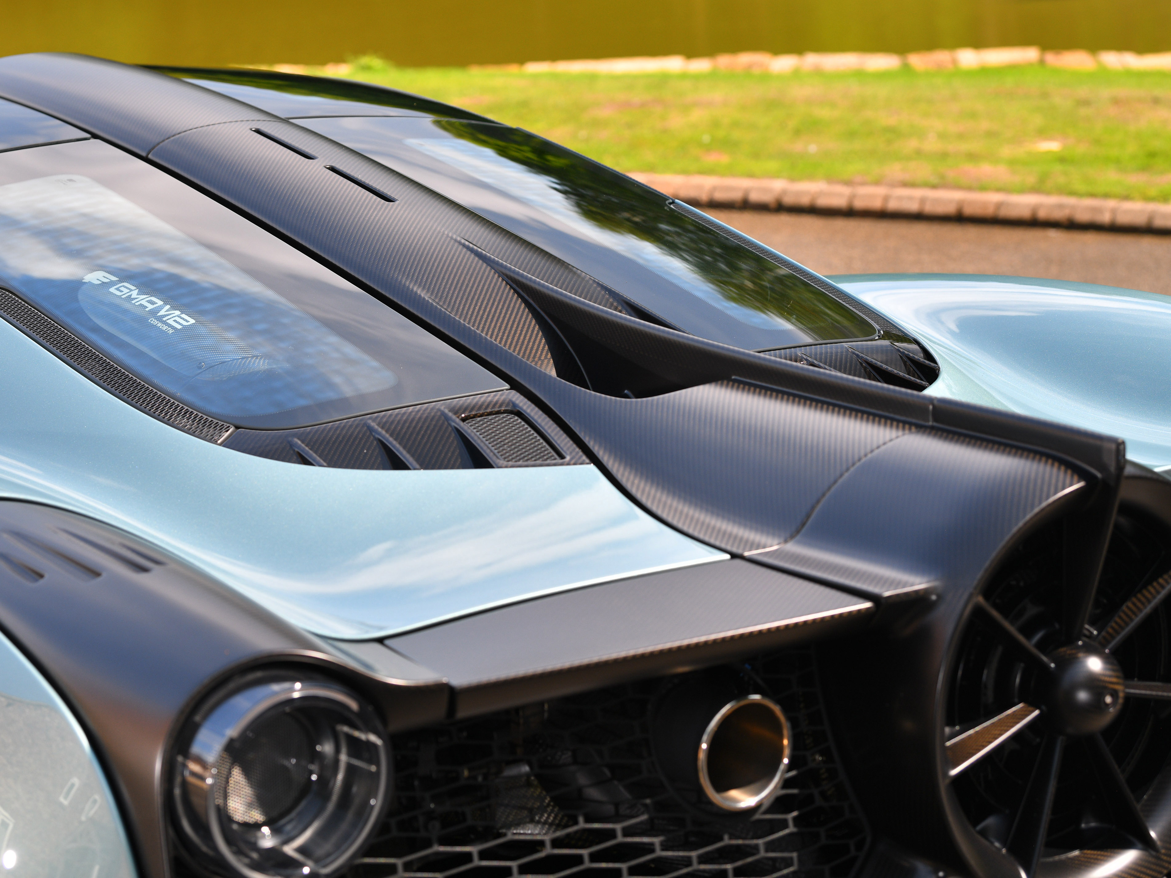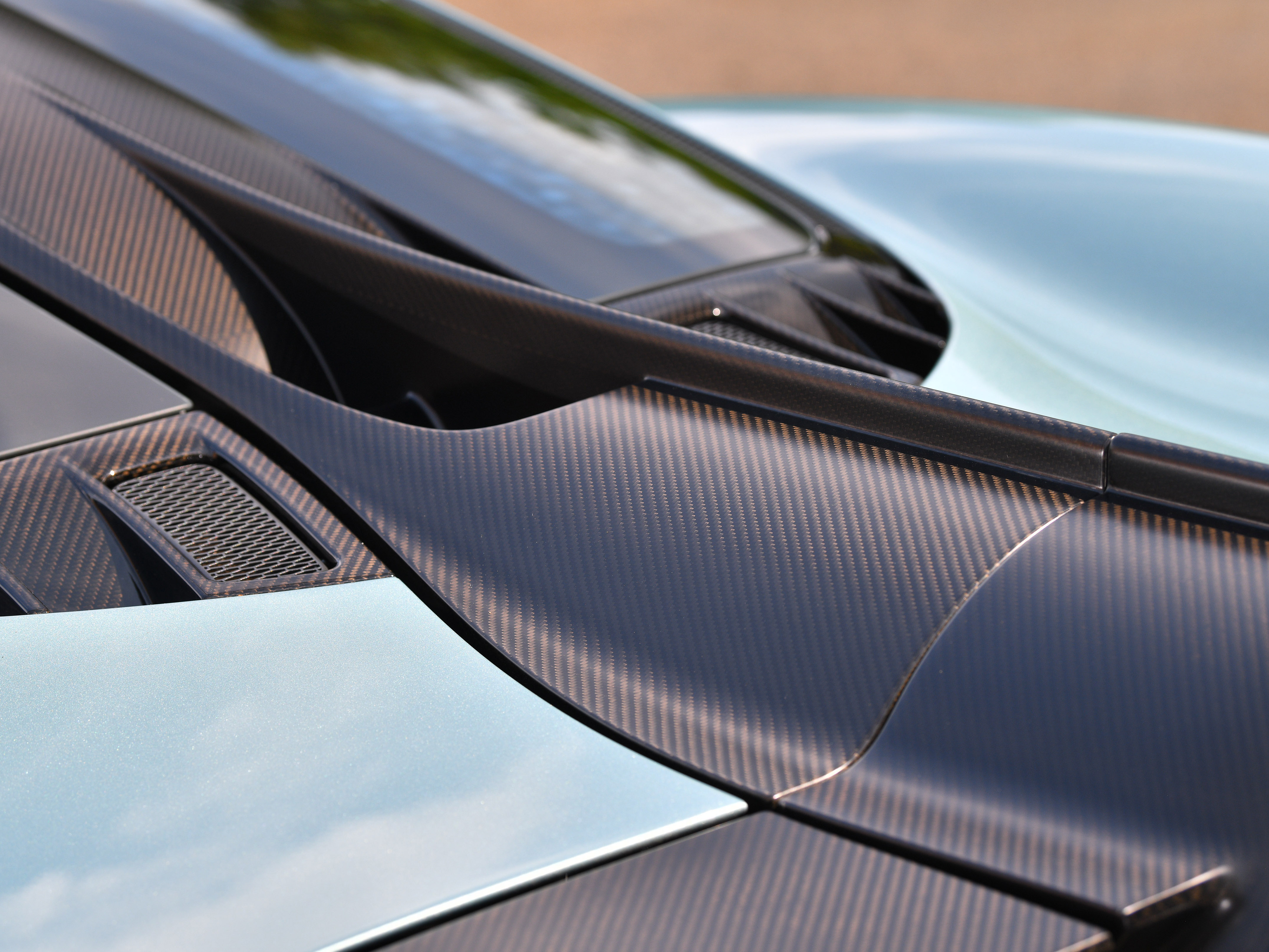 This example, chassis 063 was commissioned in the bespoke exterior colour ‘Arnage’ with bodywork panels in satin carbon fibre with a subtle tint, contrasted by a gloss carbon airbox. The exhaust and muffler were both finished in bespoke black, a non-standard factory option giving the car a purposeful edge, complemented by black cam covers, silver brake callipers and a factory glass roof.